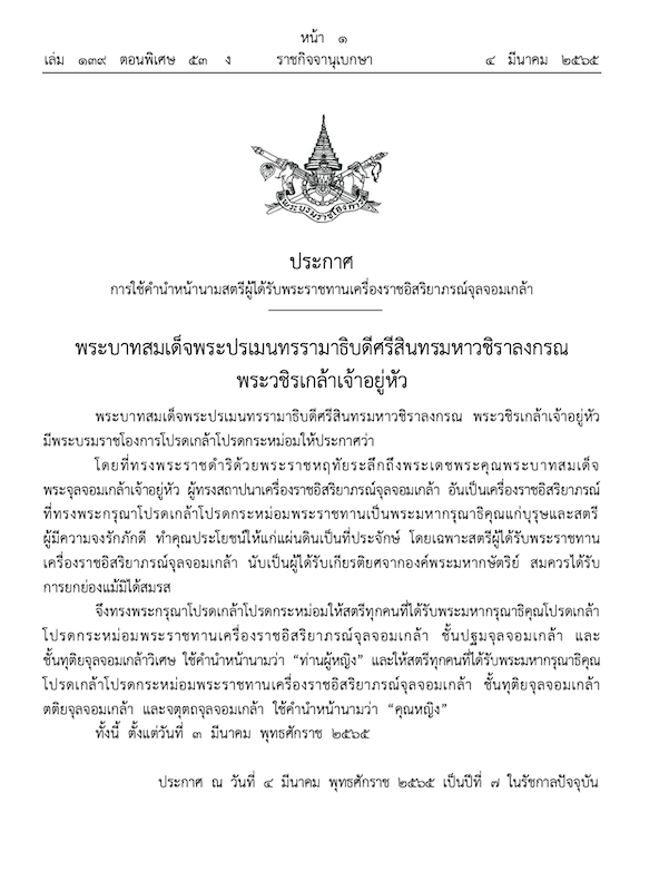 ผู้สื่อข่าวรายงายว่า เว็บไซต์ราชกิจจา ได้เผยแพร่ พระบรมราชโองการ ประกาศใช้คำนำหน้านามสตรีผู้ได้รับพระราชทานเครื่องราชอิสริยาภรณ์จุลจอมเกล้า “ท่านผู้หญิง-คุณหญิง” มีความว่า