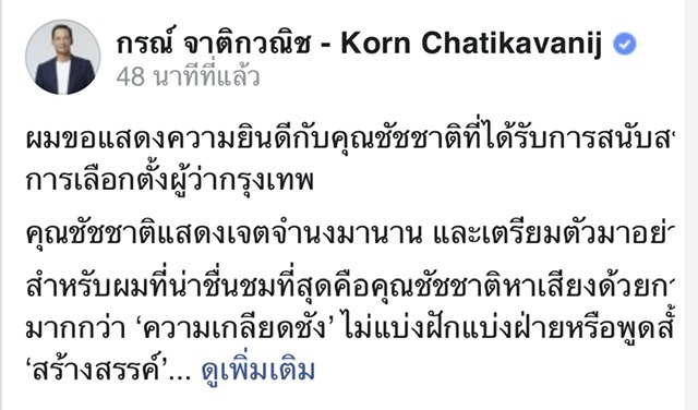 วันนี้ (22 พ.ค.65) นายกรณ์ จาติกวณิช หัวหน้าพรรคกล้า และอดีต รมว.คลัง ได้โพสต์ข้อความผ่านเฟซบุ๊กส่วนตัว โดยแสดงความยินดีกับ นายชัชชาติ สิทธิพันธุ์ ผู้สมัครรับเลือกตั้งผู้ว่าฯ กทม. หลังคะแนนยังไม่เป็นทางการนำมาเป็นอันดับ 1 ว่า ผมขอแสดงความยินดีกับคุณชัชชาติที่ได้รับการสนับสนุนอย่างท่วมท้นในการเลือกตั้งผู้ว่ากรุงเทพฯ