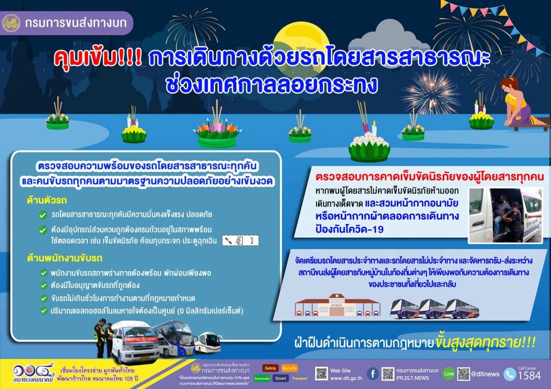 นายธานี สืบฤกษ์ รองอธิบดีกรมการขนส่งทางบก และโฆษกกรมการขนส่งทางบก เปิดเผยว่า ช่วงเทศกาลลอยกระทงปีนี้ แม้จะไม่ใช่วันหยุดยาวประกอบกับสถานการณ์การแพร่ระบาดของโรคติดเชื้อไวรัสโคโรนา 2019 (COVID-19) ยังไม่เข้าสู่ภาวะปกติ แต่คาดว่ายังคงมีประชาชนเดินทางออกมาเที่ยวชมงานลอยกระทงในท้องถิ่นของตนเอง หรือในจังหวัดแหล่งท่องเที่ยวสำคัญ ดังนั้นกรมการขนส่งทางบกจึงได้สั่งการให้ทุกสำนักงานขนส่งทุกแห่ง เตรียมพร้อมอำนวยความสะดวกและความปลอดภัยในการเดินทางช่วงเทศกาลลอยกระทง โดยประสานผู้ประกอบการขนส่งจัดเตรียมรถโดยสารประจำทางและรถโดยสารไม่ประจำทางให้เพียงพอกับความต้องการของประชาชนทั้งเที่ยวไปและกลับ และจัดหารถรับ-ส่งระหว่างสถานีขนส่งผู้โดยสารกับหมู่บ้านในท้องถิ่นต่างๆ ให้เพียงพอกับความต้องการเดินทาง
