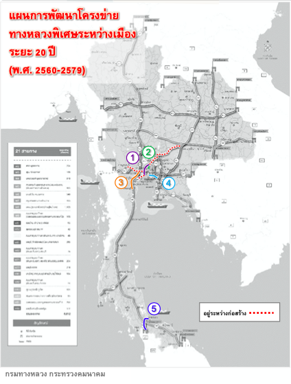 ด้านนายธนศักดิ์ วงศ์ธนากิจเจริญ ผู้อำนวยการกองทางหลวงพิเศษระหว่างเมือง กล่าวว่า แผนลงทุนพัฒนาโครงข่ายทางหลวงพิเศษระหว่างเมือง (มอเตอร์เวย์) ระยะ 20 ปี (ปี60-79) ทาง ทล.ได้จัดอันดับความสำคัญไว้ทั้งหมดใน 5 โครงการ วงเงินลงทุนกว่า 2.5 แสนล้านบาท ซึ่งจะเริ่มทยอยลงทุนได้ปี 65-70 ซึ่งส่วนนี้ถือเป็นส่วนสำคัญที่ช่วยอัดฉีดเม็ดเงินกระตุ้นเศรษฐกิจ และทำให้เกิดการจ้างงานได้เพิ่ม ประกอบด้วย 1.มอเตอร์เวย์วงแหวนรอบนอกกรุงเทพฯ ด้านตะวันตก (M9) วงเงินลงทุน 79,060 ล้านบาท ระยะทางรวม 37 กม. โดยแบ่งเป็นช่วงบางขุนเทียน-บางบัวทอง กำลังขออนุมัติรูปแบบร่วมทุนระหว่างภาครัฐและเอกชน ส่วนช่วงบางบัวทอง-บางปะอิน ดำเนินการออกแบบเสร็จแล้ว คาดก่อสร้างระหว่างปี 66 – 68