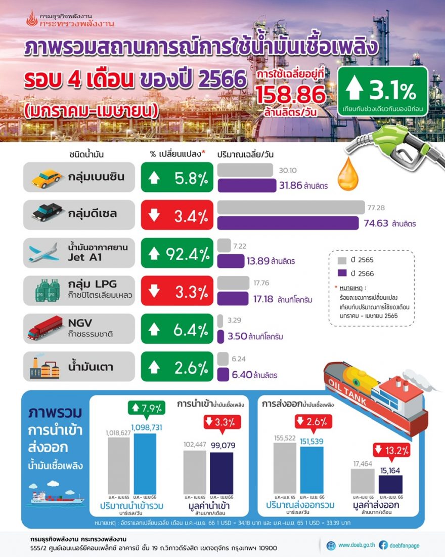 นางสาวนันธิกา ทังสุพานิช อธิบดีกรมธุรกิจพลังงาน เปิดเผยภาพรวมการใช้น้ำมันเชื้อเพลิง รอบ 4 เดือน ของปี2566 (..-เม..) ว่า มียอดใช้เฉลี่ยอยู่ที่ 158.86 ล้านลิตร/วัน เพิ่มขึ้นเมื่อเทียบกับช่วงเดียวกันของปีก่อน 3.1% และคาดว่าในครึ่งปีหลัง การใช้น้ำมันเชื้อเพลิงทุกชนิดมีแนวโน้มปรับตัวเพิ่มขึ้น ซึ่งเป็นการส่งสัญญาณการฟื้นตัวของเศรษฐกิจในประเทศอย่างเห็นได้ชัด