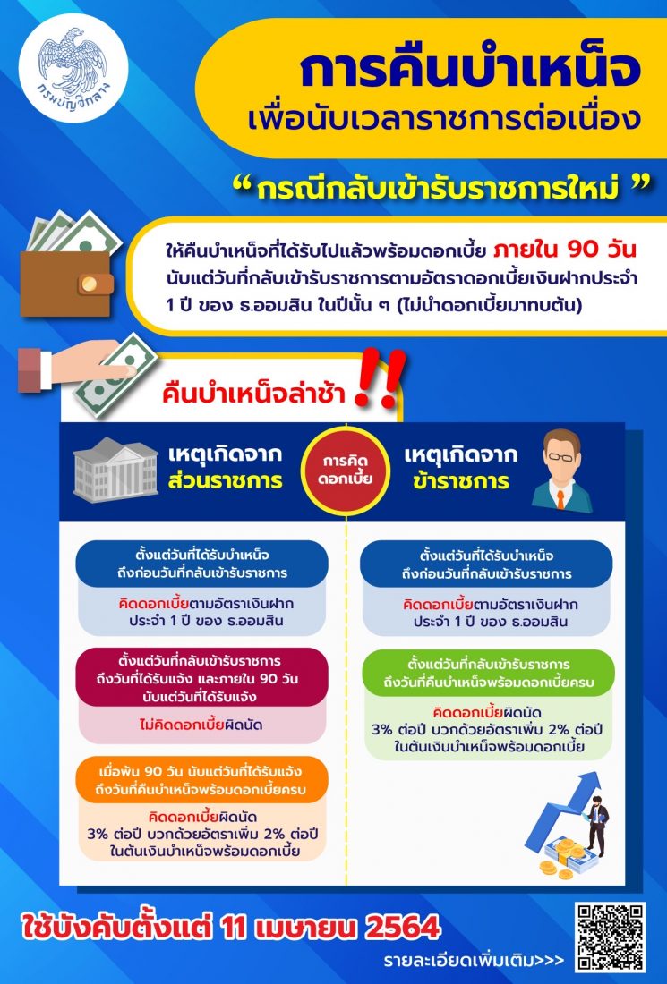 “หลักเกณฑ์ดังกล่าวได้ปรับปรุงการคิดอัตราดอกเบี้ยในการคืนบำเหน็จล่าช้า จากเดิมในอัตรา 7.5% ต่อปี ปรับเป็นอัตรา 3% ต่อปี บวกด้วยอัตราเพิ่ม 2% ต่อปี ในต้นเงินบำเหน็จพร้อมดอกเบี้ย และมีผลใช้บังคับย้อนหลังตั้งแต่วันที่11 เมษายน 2564 ซึ่งเป็นวันที่พระราชกำหนดแก้ไขเพิ่มเติมประมวลกฎหมายแพ่งและพาณิชย์ พ.ศ. 2564 ใช้บังคับสำหรับส่วนราชการที่ได้มีการคิดดอกเบี้ยในการคืนบำเหน็จล่าช้าในอัตรา 7.5% ต่อปี ตั้งแต่วันที่ 11 เมษายน 2564 และส่วนราชการได้นำเงินส่งคลังไปแล้ว ให้ส่วนราชการขอถอนคืนเงินรายได้แผ่นดินตามข้อบังคับกระทรวงการคลังและหลักเกณฑ์ที่เกี่ยวข้อง เพื่อคืนให้แก่ผู้กลับเข้ารับราชการใหม่ต่อไป รายละเอียดเพิ่มเติมตามหนังสือกระทรวงการคลัง ที่ กค 0408.3/ว 109 ลงวันที่ 27 มิถุนายน 2566 ทั้งนี้ สามารถสอบถามเพิ่มเติมได้ที่ Call Center กรมบัญชีกลาง 0 2270 6400 ในวัน เวลาราชการ”