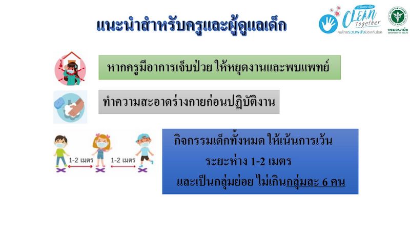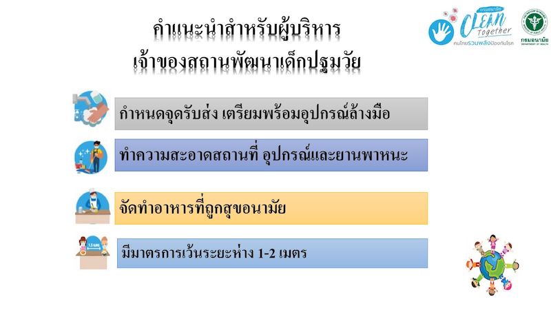ทั้งนี้กรมอนามัยได้จัดเตรียมคำแนะนำการป้องกันตนเองและการปฏิบัติเพื่อให้ 3 กลุ่มสำคัญที่มีส่วนร่วมต่อการเปิดสถานพัฒนาเด็กเล็ก กลุ่มแรกคือเจ้าของสถานพัฒนาเด็กเล็กปฐมวัย ได้กำหนดให้แต่ละแห่งจัดทำแนวทางการปฏิบัติ ทั้งการทำความสะอาดสถานที่ สิ่งของเครื่องใช้ จุดสัมผัสต่างๆ รวมถึงยานพาหนะที่ใช้รับส่งให้สะอาดปลอดภัย วางแนวทางการคัดกรอง การสื่อสารกับครูพี่เลี้ยงและผู้ปกครองเพื่อกำหนดมาตรการร่วมกัน รวมทั้งกำหนดการเว้นระยะห่างในการทำกิจกรรมต่างๆ ให้กับเด็กๆ