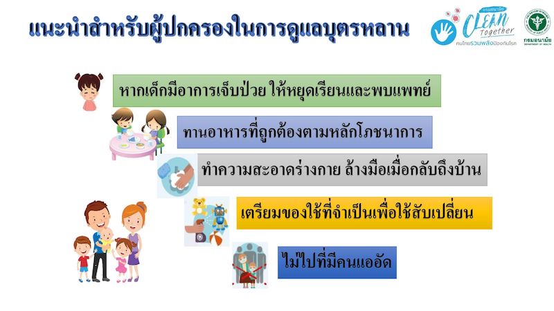 สำหรับผู้ปกครองซึ่งเป็นกลุ่มที่มีความสำคัญ ขอความร่วมมือหากพบว่าบุตรหลานของตนเองมีอาการป่วย มีไข้ ไอ มีน้ำมูก หรือเหนื่อยหอบ หรือคนในครอบครัวป่วยด้วยโรคโควิด 19 หรือกลับจากพื้นที่เสี่ยงและอยู่ในช่วงกักตัว ต้องขอให้เด็กหยุดเรียนและปฏิบัติตามคำแนะนำของเจ้าหน้าที่สาธารณสุขอย่างเคร่งครัด นอกจากนี้ ต้องเตรียมของใช้ส่วนตัวของเด็ก เช่น หน้ากากผ้า เสื้อผ้า เพื่อใช้ในสถานพัฒนาเด็กปฐมวัยในแต่ละวัน เมื่ออยู่บ้านเตรียมอาหารถูกหลักโภชนาการ เน้นโปรตีน ปรุงสุกใหม่ ออกกำลังกาย พักผ่อนให้เพียงพอ และดูแลทำความสะอาดช่องปากและ เพื่อใช้ในสถานพัฒนาเด็กปฐมวัยในฟันของเด็ก สุดท้ายขอย้ำเรื่องสำคัญคือ การรับเด็กเล็กกลับบ้านไม่ควรแวะตามสถานที่ชุมชน ขอให้รีบกลับบ้าน และให้เด็กอาบน้ำเปลี่ยนเสื้อผ้าทันทีเมื่อถึงบ้าน เพื่อสุขอนามัยที่ดีของบุตรหลาน