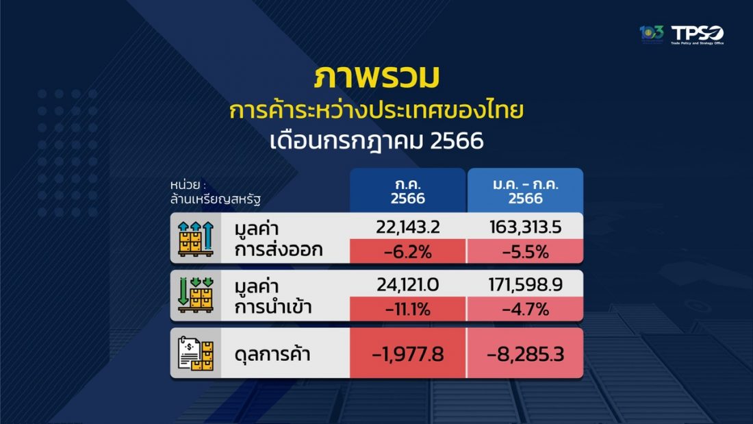 นายกีรติ รัชโน ปลัดกระทรวงพาณิชย์ เปิดเผยถึงสถิติการค้าระหว่างประเทศของไทยว่า เดือนก.ค.66 การส่งออก มีมูลค่า 22,143.2 ล้านเหรียญสหรัฐฯ ลดลง 6.2% เมื่อเทียบเดือนก.ค.65 เมื่อคิดเป็นเงินบาทมีมูลค่า 764,444 ล้านบาท ลดลง 7.7% การนำเข้า 24,121 ล้านเหรียญฯ ลดลง 11.1% คิดเป็นเงินบาท 842,842.7 ล้านบาท ลดลง 12.5% ขาดดุลการค้า 1,977.8 ล้านเหรียญฯ หรือขาดดุล 78,398.7 ล้านบาท ส่วนในช่วง 7 เดือน (ม.ค.-ก.ค.) ปี 66 การส่งออกมีมูลค่า 163,313.5 ล้านเหรียญฯ ลด 5.5% เทียบช่วงเดียวกันปี 65 คิดเป็นเงินบาท 5.554 ล้านล้านบาท ลดลง3.8% การนำเข้า 171,598.9 ล้านเหรียญฯ ลด 4.7% คิดเป็นเงินบาท 5.910 ล้านล้านบาท ลดลง 3.1% ขาดดุลการค้า 8,285.3 ล้านเหรียญฯ หรือขาดดุล 355,560.8 ล้านบาท