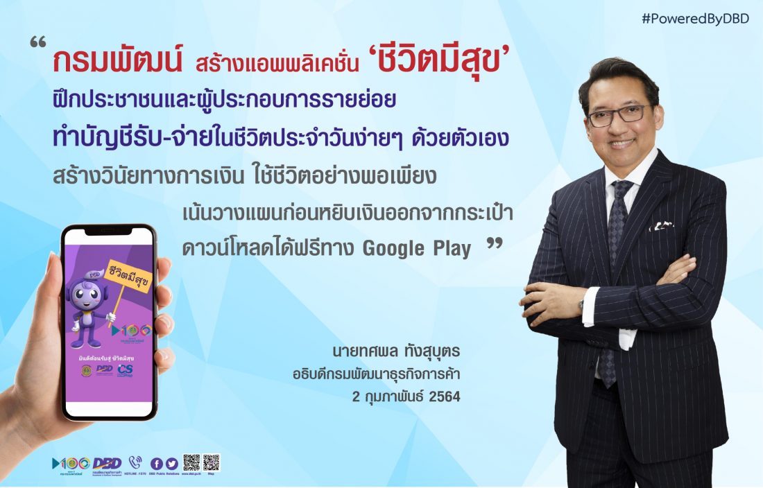 นายทศพล ทังสุบุตร อธิบดีกรมพัฒนาธุรกิจการค้า กระทรวงพาณิชย์ เปิดเผยว่า กรมได้ร่วมกับ บริษัท คริสตอลซอฟท์ จำกัด (มหาชน) จัดทำแอปพลิเคชั่น “ชีวิตมีสุข” โดยออกแบบให้ใช้งานง่าย ผ่านทางสมาร์ทโฟน หรือ แท็บเล็ต ได้ทุกที่ทุกเวลา และไม่มีค่าใช้จ่าย เพื่อให้ประชาชน และผู้ประกอบการรายย่อยใช้บันทึกรายรับ-รายจ่ายในชีวิตประจำวัน รวมทั้ง ปรับเปลี่ยนทัศนคติให้เห็นว่า การทำบัญชีไม่ใช่เรื่องยากอีกต่อไป ซึ่งสามารถดาวน์โหลดได้ฟรีทาง Google Play ด้วยระบบแอนดรอยด์ เวอร์ชั่น 5 ขึ้นไป (ระยะเริ่มต้นใช้งานได้เฉพาะระบบแอนดรอยด์เท่านั้น)