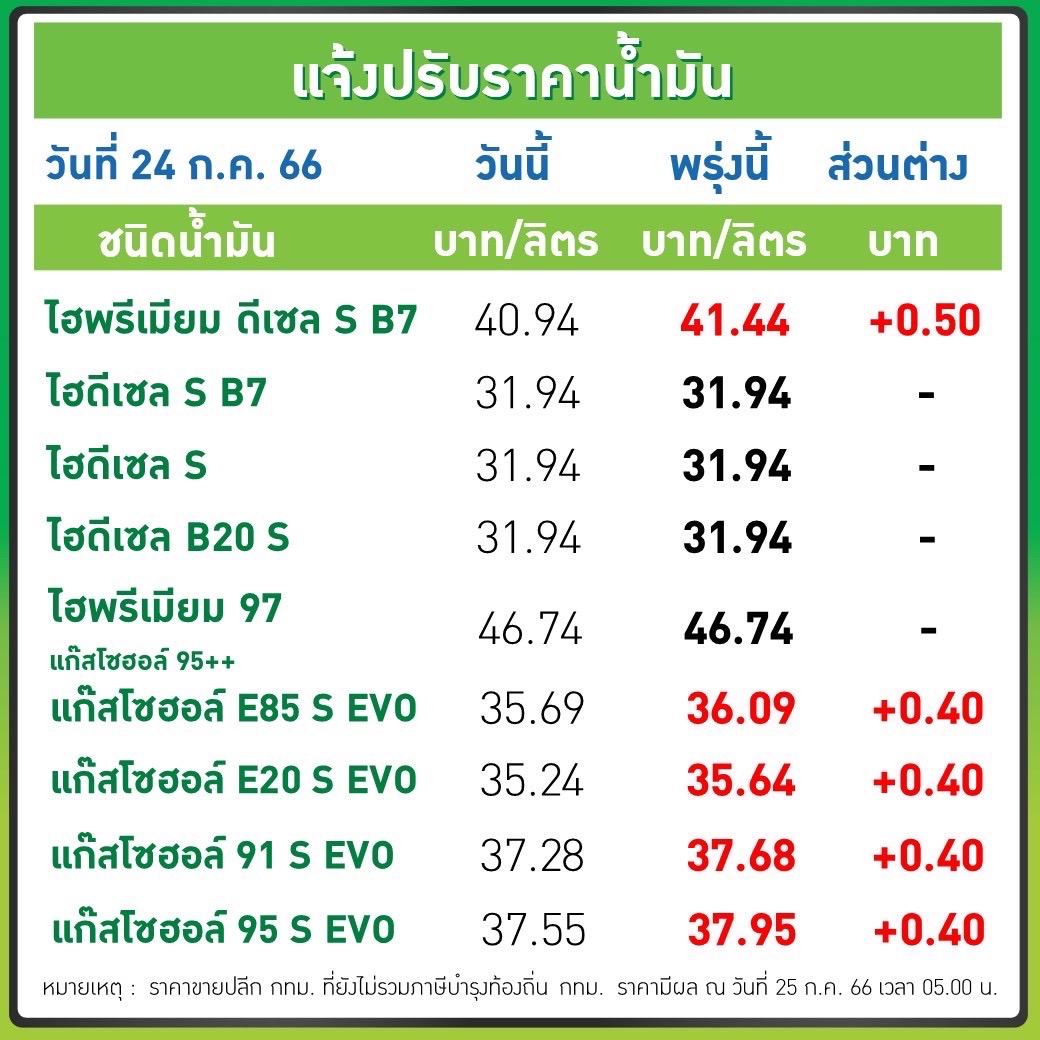 เบนซินแก๊สโซฮอล์ 95 S EVO ลิตรละ 37.95 บาท, แก๊สโซฮอล์ 91 S EVO ลิตรละ 37.68 บาท, แก๊สโซฮอล์ E20 S EVO ลิตรละ 35.64 บาท และแก๊สโซฮอล์ E85 S EVO ลิตรละ 36.09 บาท ไฮพรีเมียม 97 (แก๊สโซฮอล์ 95++) 46.74 บาท