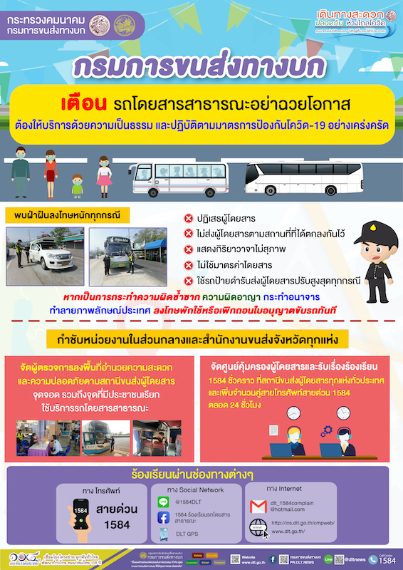 พร้อมกำชับมาตรการป้องกันและควบคุมการแพร่ระบาดของโรคติดเชื้อไวรัสโคโรนา 2019 (COVID-19) ในรถโดยสารสาธารณะ และสถานีขนส่งผู้โดยสารให้เป็นไปตามมาตรการป้องกันขั้นสูง เพื่อให้การเดินทางด้วยรถโดยสารสาธารณะของประชาชนปลอดภัย ห่างไกลจากโควิด จัดให้มีมาตรการคัดกรองผู้โดยสารและตรวจวัดอุณหภูมิ ตรวจคัดกรองพนักงานขับรถและผู้ให้บริการ เพิ่มความถี่ในการทำความสะอาดพื้นผิวสัมผัสภายในรถ ภายในสถานีขนส่งผู้โดยสาร งดการให้บริการอาหารบนรถในระหว่างการเดินทาง กำกับดูแลให้พนักงานขับรถ ผู้ให้บริการ สวมหน้ากากอนามัยหรือหน้ากากผ้าตลอดการเดินทาง และดูแลให้ผู้โดยสารสวมหน้ากากอนามัยหรือหน้ากากผ้าตลอดการเดินทาง