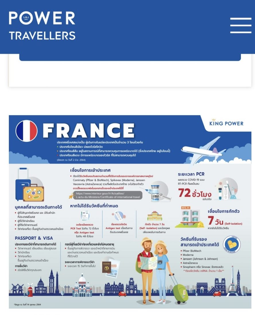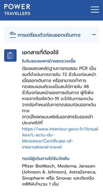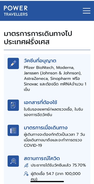 จากนั้นทางเว็บไซต์ ก็จะแสดงรายละเอียดของมาตรการการเดินทางไปประเทศฝรั่งเศส โดยบอกรายละเอียดตั้งแต่วัคซีนที่ฉีดแล้วอนุญาตให้เข้าประเทศได้ โดยฝรั่งเศสอนุญาตวัคซีน Pfizer BioNtech, Moderna, Janssen (Johnson & Johnson), AstraZeneca, Sinopharm หรือ Sinovac และต้องฉีด mRNA จำนวน 1 เข็ม