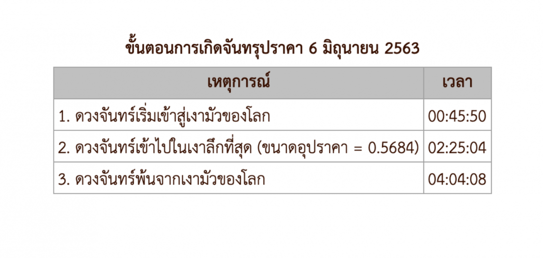 ผู้สื่อข่าวรายงานว่า สมาคมดาราศาสตร์ไทย ได้เปิดเผยข้อมูลว่า ใหลังเที่ยงคืนของวันที่ 5 มิถุนายน 2563 ที่เข้าสู่วันใหม่ วันที่ 6 มิ.ย. 63 จะเกิดปรากฎการณ์ ‘จันทรุปราคาเงามัว’ ซึ่งสามารถเห็นได้ในประเทศไทยด้วย ทั้งนี้คาดการณ์ว่าดวงจันทร์จะเข้าสู่เงามัวมากที่สุด ณ เวลา 02:25 น. พื้นที่ประมาณครึ่งหนึ่งของดวงจันทร์จะถูกเงามัวบดบัง ซึ่งทำให้จันทร์เพ็ญหมองคล้ำกว่าปกติ แต่อาจสังเกตเห็นด้วยตาเปล่าค่อนข้างบยาก ส่วนพื้นที่บนโลกที่สามารถมองเห็นเหตุการณ์ ‘จันทรุปราคาเงามัว’ ครั้งนี้ได้แก่ ยุโรป แอฟริกา เอเชีย และออสเตรเลีย