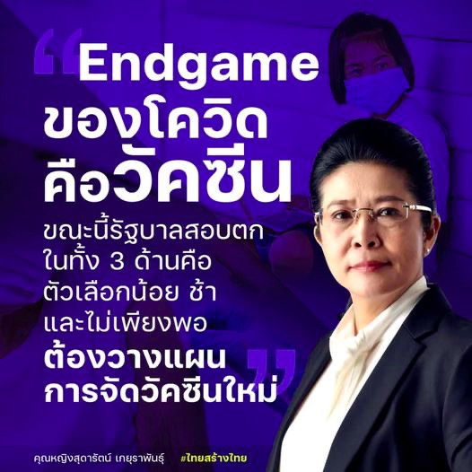 ดิฉันเห็นว่ามีความจำเป็นอย่างยิ่งที่รัฐบาลไทยต้องปรับแผนการจัดการวัคซีนใหม่ ต้องเร่งฉีดให้กับคนไทยอย่างน้อย 70% หรือ 50 ล้านคนให้จบภายในสิ้นปีนี้ เพื่อให้เกิดภูมิคุ้มกันหมู่ และสามารถเปิดประเทศ เปิดการค้าขายได้ในสิ้นปีนี้ให้ทันกับประเทศอื่นๆที่เขามีแผนงานการฉีดวัคซีน และกำหนดการเปิดประเทศที่ชัดเจนกันแล้ว