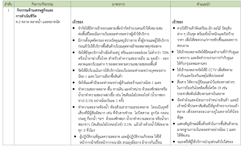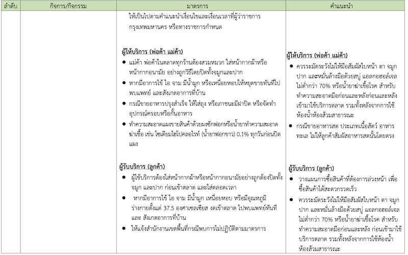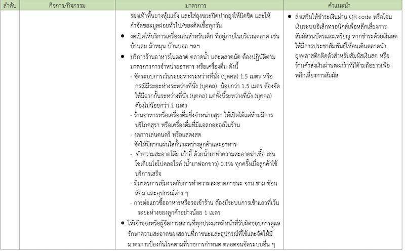 • บริการร้านอาหารในตลาด ตลาดน้ํา และตลาดนัด ต้องปฏิบัติตามมาตรการการจําหน่ายอาหาร หรือเครื่องดื่ม ดังนี้
