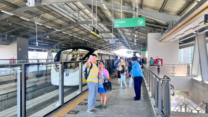 ทั้งนี้ จากการเปิดให้ประชาชน 13 สถานี ช่วงระหว่างสถานีหัวหมาก ถึงสถานีสำโรง เมื่อวันที่ 3 – 4 มิ.. 2566 มีประชาชนให้ความสนใจมาใช้บริการ ทั้งสิ้น 38,521 และ 36,879 คน/เที่ยว ตามลำดับ ซึ่งส่งผลให้ยอดผู้ใช้บริการระบบขนส่งทางรางรวมมีปริมาณเพิ่มสูง (1,059,648 คน/เที่ยว ในวันที่ 3 มิ.. 66 และ 920,758 คน/เที่ยว ในวันที่มิ.. 66) ทั้งที่เป็นช่วงวันหยุดราชการ และคาดว่าในวันทำงานปกติจะมีผู้มาทดลองใช้บริการรถไฟฟ้าโมโนเรลสายสีเหลืองเป็นจำนวนมากยิ่งขึ้น ไม่ว่าจะการเชื่อมต่อไปยังรถไฟฟ้าสายสีอื่นๆ หรือจากสายอื่นมาต่อสายสีเหลืองเพราะจะช่วยประหยัดเวลาในการเดินทาง รวมทั้งบรรเทาการจราจรติดขัดได้อย่างมาก