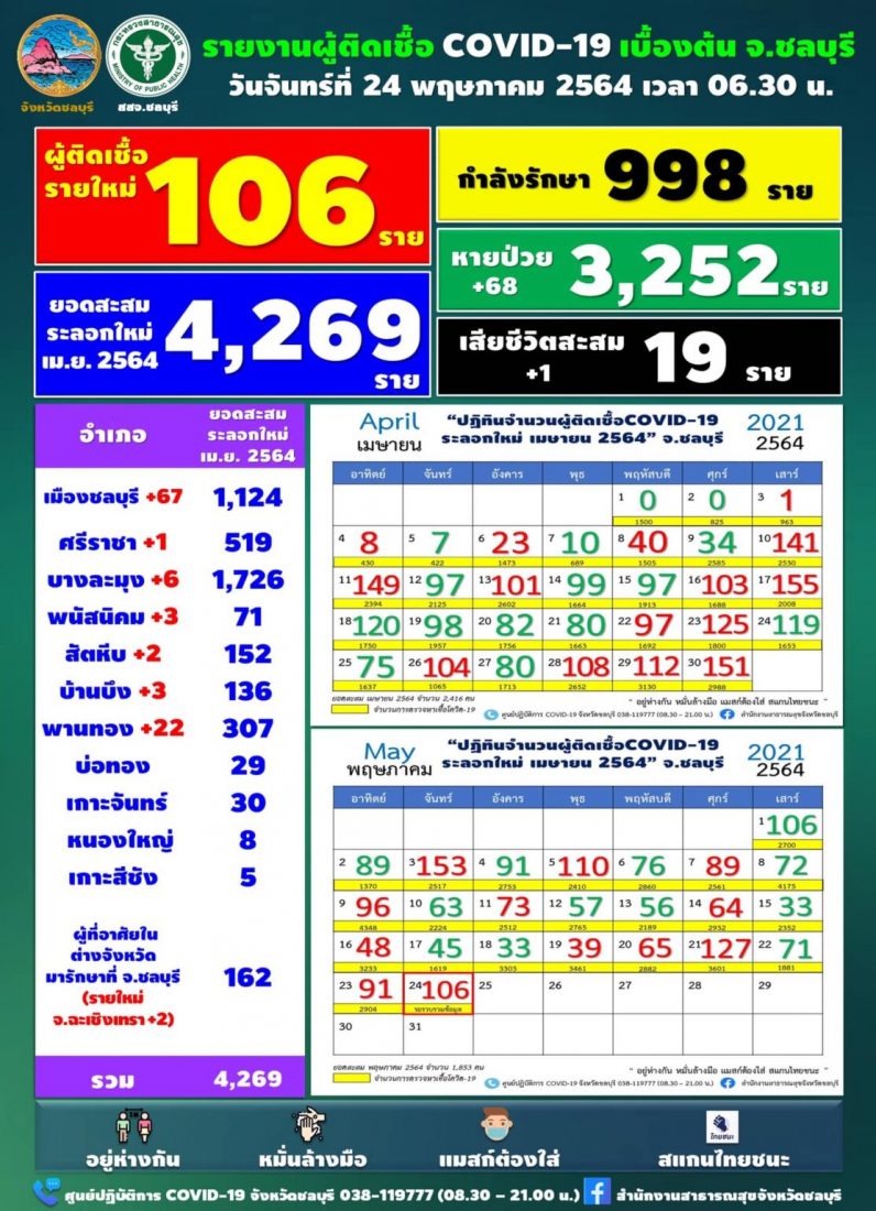 วันที่ 24 พ.ค.2564 มีรายงานผู้ติดเชื้อโควิด-19 รายใหม่ จำนวน 106 ราย ได้แก่ 1. Cluster บริษัท เซเรอเลส 72 ราย 2. Cluster ตลาดใหม่ 4 ราย 3. สัมผัสผู้ป่วยยืนยัน (เชื่อมโยง บริษัท โอคุมุระ) 3 ราย 4. สัมผัสผู้ป่วยยืนยัน (ในครอบครัว เชื่อมโยง บริษัท โอคุมุระ) 1 ราย 5. สัมผัสผู้ป่วยยืนยัน (ในครอบครัว เชื่อมโยง บริษัท เซเลอเรส) 1 ราย 6. สัมผัสผู้ป่วยยืนยันมีประวัติเชื่อมโยงจากต่างจังหวัด 6.1 จังหวัดปราจีนบุรี 1 ราย 6.2 จังหวัดระยอง 1 ราย 7. สัมผัสผู้ป่วยยืนยันในครอบครัว 2 ราย 8. ผู้สัมผัสผู้ป่วยยืนยัน ซึ่งอยู่ระหว่างสอบสวนโรค 4 ราย 9. อยู่ระหว่างการสอบสวนโรค 17 ราย