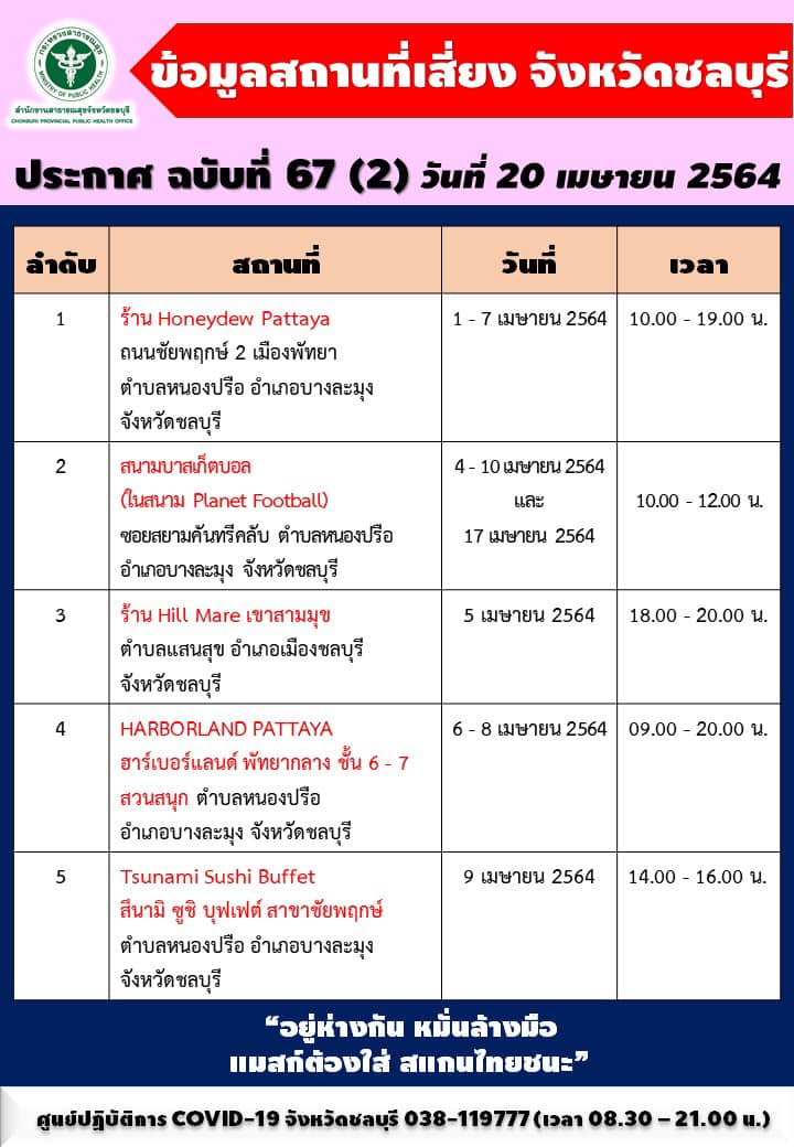 ผู้สื่อข่าวรายงานเพิ่มเติมว่า วานนี้(20เม.ย.) สสจ.ชลบุรี ได้ออกประกาศ 67(2) ลงวันที่ 20 เมษายน 2564 เตือนห้ามไปพื้นที่เสี่ยง 5 สถานที่ด้วยกัน ประกอบด้วย 1. ร้าน Honeydew Pattaya อ.บางละมุง จ.ชลบุรี 2.สนามบาสเก็ตบอล(ในสนาม planet football) อ.บางละมุง 3.ร้าน Hill Mare เขาสามมุข 4.ร้านฮาเบอร์แลนด์ พัทยากลาง และ5.สึนามิ ซูชิ บุฟเฟ่ต์ อ.บางละมุง