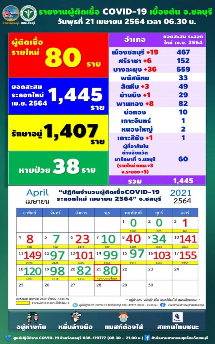 วันที่ 21 เมษายน 2564 สำนักงานสาธารณสุขจังหวัดชลบุรี (สสจ.ชลบุรี) รายงานตัวเลขผู้ติดเชื้อโควิด-19 ว่า วันนี้พบผู้ติดเชื้อโควิด-19 รายใหม่ จำนวน 80 ราย แยกเป็น 1.เป็นผู้ติดเชื้อโควิด-19 จาก Cluster Flintstone 3 ราย (ตั้งแต่วันที่ 6 เมษายน 2564 เป็นจำนวนทั้งสิ้น 155 ราย)