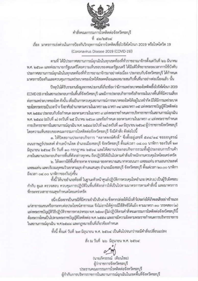 เมื่อวันที่ 26 มิถุนายน 2564 นายภัครธรณ์ เทียนไชย ผู้ว่าราชการจังหวัดชลบุรี และประธานคณะกรรมการโรคติดต่อจังหวัดชลบุรี ได้มีคำสั่งคณะกรรมการโรคติดต่อจังหวัดชลบุรีที่ 41/2564 ลงวันที่ 26 มิถุนายน 2564 ให้ปิดสถานประกอบกิจการ “ตลาดพงษ์ศักดิ์ “ ตั้งอยู่ถนนราษฎร์ประสงค์ ต.บ้านโขด อ.เมือง จ.ชลบุรี ตั้งแต่เวลา 08.00 น. ของวันที่ 27 มิถุนายน 2564 ถึงวันที่ 10 กรกฎาคม 2564 และให้สถานประกอบกิจการรวมทั้งผู้ประกอบการร้านค้าภายในสถานประกอบกิจการพื้นที่ดังกล่าวทุกคน ถือปฏิบัติให้เป็นตามคำสั่งเจ้าพนักงานควบคุมโรคโดยเคร่งครัด