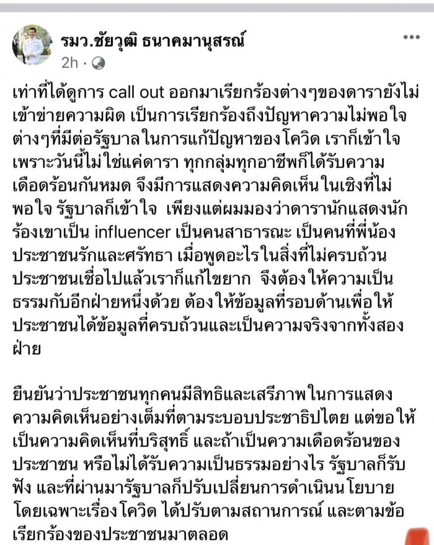วันที่ 22 ก.ค.2564 นายชัยวุฒิ ธนาคมานุสรณ์ รัฐมนตรีว่าการกระทรวงดิจิทัลเพื่อเศรษฐกิจและสังคม (ดีอีเอส) โพสต์เฟสบุ๊ค โดยระบุว่า เท่าที่ได้ดูการ call out ออกมาเรียกร้องต่างๆของดารายังไม่เข้าข่ายความผิด เป็นการเรียกร้องถึงปัญหาความไม่พอใจต่างๆที่มีต่อรัฐบาลในการแก้ปัญหาของโควิด เราก็เข้าใจ เพราะวันนี้ไม่ใช่แค่ดารา ทุกกลุ่มทุกอาชีพก็ได้รับความเดือดร้อนกันหมด จึงมีการแสดงความคิดเห็นในเชิงที่ไม่พอใจ รัฐบาลก็เข้าใจ