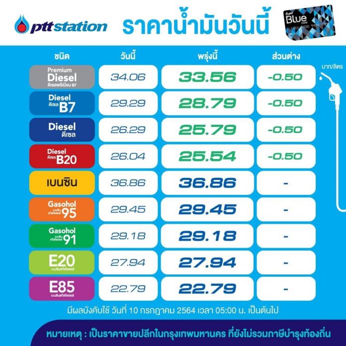 ส่วนน้ำมันดีเซล ลิตรละ 25.79 บาท, ดีเซล B7 ลิตรละ 28.79 บาท, ดีเซล B20 ลิตรละ 25.54 บาท และดีเซลพรีเมียม 33.56 บาทต่อลิตร