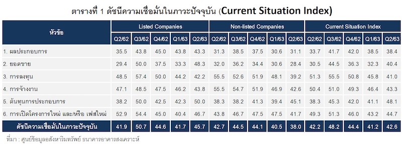 อย่างไรก็ตามเมื่อแยกกลุ่มผู้ประกอบการ ตามประเภทบริษัทพบว่า ความเชื่อมั่นในภาวะปัจจุบันของผู้ประกอบการกลุ่มบริษัทจดทะเบียน มีค่าดัชนีเท่ากับ 45.7 จุด เพิ่มขึ้นจากไตรมาสก่อนหน้า ซึ่งมีค่าดัชนีอยู่ที่ 41.7 จุด ขณะที่ผู้ประกอบการกลุ่มทั่วไป มีค่าดัชนีเท่ากับ 38.0 ลดลงจากไตรมาสก่อนหน้าที่มีค่าดัชนีอยู่ที่ 40.5 จุด