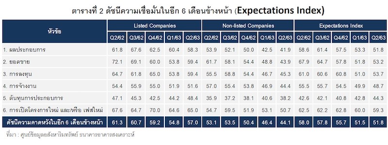ส่วนผู้ประกอบการกลุ่มบริษัทจดทะเบียน มีค่าดัชนีความเชื่อมั่นในอีก 6 เดือนข้างหน้าเท่ากับ 57.0 จุด เพิ่มขึ้นจากไตรมาสก่อนซึ่งอยู่ที่ระดับ 54.8 จุด ขณะที่ผู้ประกอบการกลุ่มทั่วไป มีค่าดัชนีเท่ากับ 44.1 จุด ลดลงจากไตรมาสก่อนหน้าซึ่งอยู่ที่ระดับ 46.4 จุด