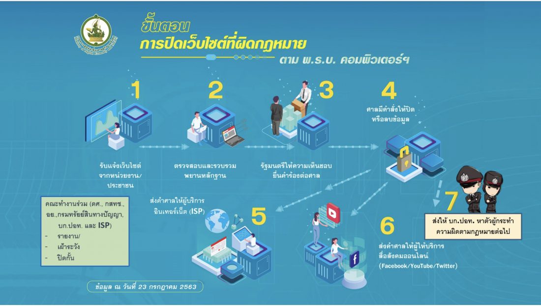 นายพุทธิพงษ์ ปุณณกันต์ รมว.ดิจิทัลเพื่อเศรษฐกิจและสังคม (ดีอีเอส) เปิดเผยว่า กระทรวงดีอีเอส และสำนักงานคณะกรรมการกิจการกระจายเสียง กิจการโทรทัศน์ และกิจการโทรคมนาคมแห่งชาติ (กสทช.) และผู้ให้บริการอินเทอร์เน็ต (ไอเอสพี) ผู้ให้บริการโทรคมนาคม ได้ร่วมมือกัน ดำเนินการมาตรการเชิงรุกเกี่ยวกับเรื่องการกระทำความผิดทางออนไลน์ โดยในรอบ 7 เดือน (ม.ค.-ก.ค.) ปี 2563 กระทรวงดีอีเอส และหน่วยงานที่เกี่ยวจ้อง ได้รวบรวมพยานหลักฐาน และยื่นคำร้องต่อศาลเพื่อขอให้ศาลมีคำสั่งปิดหรือลบข้อมูลในเว็บไซต์ผิดกฎหมายไปแล้ว จำนวน 7,164 ยูอาร์แอล จากที่ได้รับแจ้งทั้งสิ้น 8,715 ยูอาร์แอล ซึ่งดีอีเอส ได้ส่งข้อมูลให้กองบังคับการปราบปรามการกระทำความผิดเกี่ยวกับอาชญากรรมทางเทคโนโลยี (บก.ปอท.) ไปดำนเนินการกับผู้กระทำความผิดมาดำเนินคดีตามกฎหมายต่อไป ซึ่งการกระทำผิดส่วนใหญ่ อยู่บนเฟซบุ๊ก แต่ได้รับความร่วมมือจากเฟซบุ๊กน้อยมาก