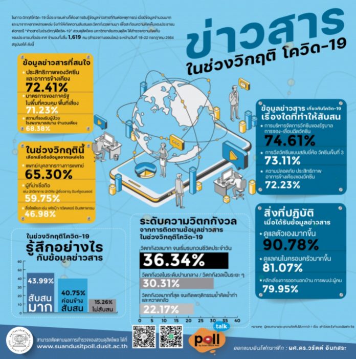 วันที่ 25 ก.ค.2564 สวนดุสิตโพล มหาวิทยาลัยสวนดุสิต สำรวจความคิดเห็นของประชาชนต่อกรณี “ข่าวสารในช่วงวิกฤติโควิด-19” กลุ่มตัวอย่างจำนวน 1,619 คน ระหว่างวันที่ 19-22 กรกฎาคม 2564 พบว่า ประชาชนสนใจข่าวประสิทธิภาพของวัคซีนและอาการข้างเคียงมากที่สุด ร้อยละ 72.41 เลือกเชื่อถือข้อมูลจากแพทย์และบุคลากรทางการแพทย์ ร้อยละ 65.30 ข้อมูลข่าวสารทำให้รู้สึกสับสนมาก ร้อยละ 43.99 โดยสับสนข้อมูลเกี่ยวกับการบริหารจัดการวัคซีนของรัฐบาล การจองและเลื่อนฉีดวัคซีนมากที่สุด ร้อยละ 74.61 เมื่อได้รับข้อมูลข่าวสารจะดูแลตัวเองมากขึ้น ร้อยละ 90.78 และภาพรวมเมื่อรับรู้ข้อมูลข่าวสารแล้วรู้สึกวิตกกังวลมากจนเริ่มรบกวนชีวิตประจำวัน ร้อยละ 36.34