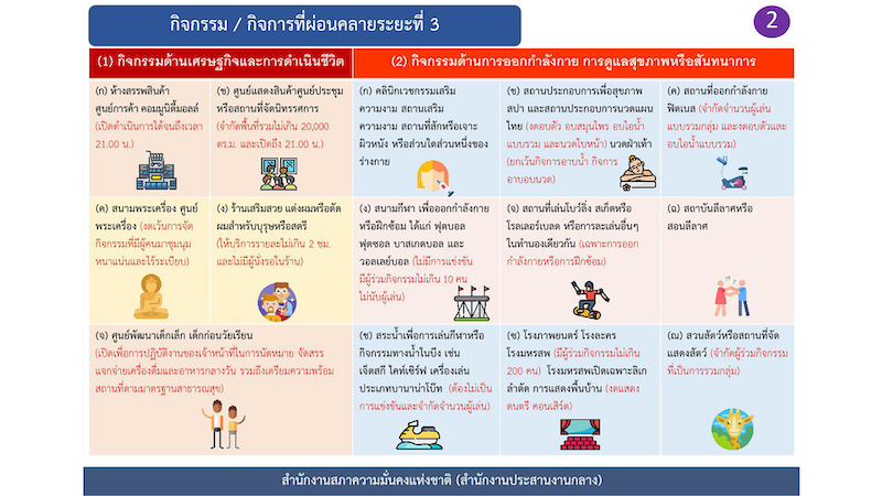 นอกจากนี้ยังมีการผ่อนคลายหลายกิจกรรม อาทิ ในส่วนอาคารสถานที่ เปิดให้สถาบันการศึกษาเพื่อใช้การคัดเลือก สอบคัดเลือก อบรมระยะสั้น ยังไม่เปิดให้มีการเรียนการสอน ส่วนโรงเรียนนอกระบบ โรงเรียนเอกชน วิชาชีพ ศิลปะการกีฬา ก็เปิดเช่นกัน ส่วนร้านเสริมสวย ร้านตัดผม เปิดให้ทำสีผมได้ ใช้เวลาในการทำกิจกรรมไม่เกิน 2 ชั่วโมง ห้ามนั่งรอในร้าน ร้านนวด สปา ดำเนินการได้ แต่ไม่มีการอาบน้ำ
