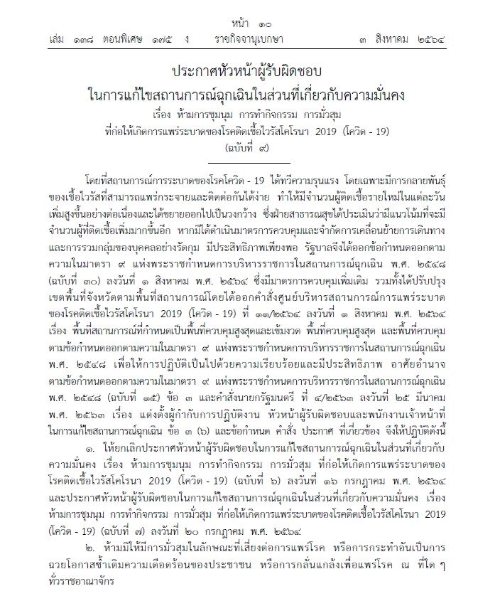 เมื่อวันที่ 4 สิงหาคม 2564 พ.ต.อ.ศิริวัฒน์ ดีพอ รองโฆษกสำนักงานตำรวจแห่งชาติ เปิดเผยว่า ตามที่ได้มี ประกาศหัวหน้าผู้รับผิดชอบในการแก้ไขสถานการณ์ฉุกเฉินในส่วนที่เกี่ยวกับความมั่นคง เรื่อง ห้ามการชุมนุม การทำกิจกรรม การมั่วสุมที่ก่อให้เกิดการแพร่ระบาดของโรคติดเชื้อไวรัสโคโรนา 2019 (โควิด–19) (ฉบับที่ 9) ลงวันที่ 3 สิงหาคม 2564 ซึ่งมีสาระสำคัญคือห้ามมิให้มีการ “มั่วสุม” ในลักษณะที่เสี่ยงต่อการแพร่โรค หรือ “การกระทำอันเป็นการฉวยโอกาสซ้ำเติมความเดือดร้อนของประชาชน” หรือการ “กลั่นแกล้งเพื่อแพร่โรค” ณ ที่ใด ๆ ทั่วราชอาณาจักร และห้ามมิให้มีการชุมนุม หรือการทำกิจกรรมที่มีความเสี่ยงต่อการแพร่โรค ในพื้นที่ที่มีประกาศหรือคำสั่งกำหนดเป็นพื้นที่ควบคุมสูงสุดและเข้มงวด พื้นที่ควบคุมสูงสุด พื้นที่ควบคุม พื้นที่เฝ้าระวังสูง พื้นที่เฝ้าระวัง เว้นแต่กรณีได้รับอนุญาตจากพนักงานเจ้าหน้าที่ หรือกิจกรรมที่ได้รับการยกเว้น