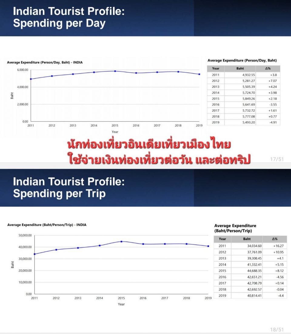 ผอ.สิริเกศอนงค์ กล่าวว่า ตลาดที่มีมูลค่าสูงจากอินเดียเที่ยวเมืองไทย ได้แก่ กลุ่มครอบครัว ซึ่งเดินทางหลายเจนเนอเรชั่น ขนาดใหญ่เดินทางพร้อมกัน 10 คนขึ้นไป/กรุ๊ป เลือกใช้ห้องพักหรูแบบพูล วิลล่า หรือมีหลายห้องรวมกัน มีวันพักเฉลี่ย 4-7 วัน/คน/ทริป รวมทั้งนิยมทำกิจกรรมท่องเที่ยวอย่างยั่งยืน การท่องเที่ยวเชิงผจญภัย ใช้จ่ายเงินเฉลี่ยจากฐานตัวเลขปี 2562 ประมาณ 5,493 บาท/คน/ทริป รวม 40,841 บาท/คน/ทริป ส่วนปี 2566 แนวโน้มน่าจะเพิ่มสูงขึ้นอีก 5-10%