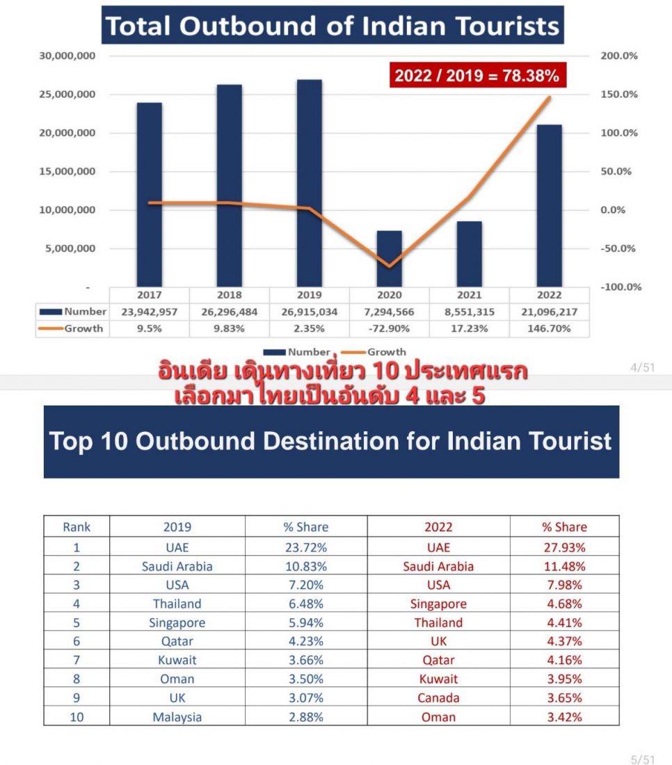 ปัจจัยที่ 5 การท่องเที่ยวฟื้นตัวแนวโน้มปี 2566 คนอินเดียจะกลับมาเดินทางเที่ยวต่างประเทศ 80-90 % โดยไทยน่าจะครองตลาดได้ในอันดับ 4 สร้างรายได้ราว 80 % ของปี 2562 จากวันพักเฉลี่ยเกินกว่า 8 วัน/คน/ทริป (เดิมทำไว้7.4 วัน/คน/ทริป) เปรียบเทียบกับปี 2562 อินเดียไปเที่ยวทั่วโลก 26.9 ล้านคน เลือกมาไทย 1.9 ล้านคน