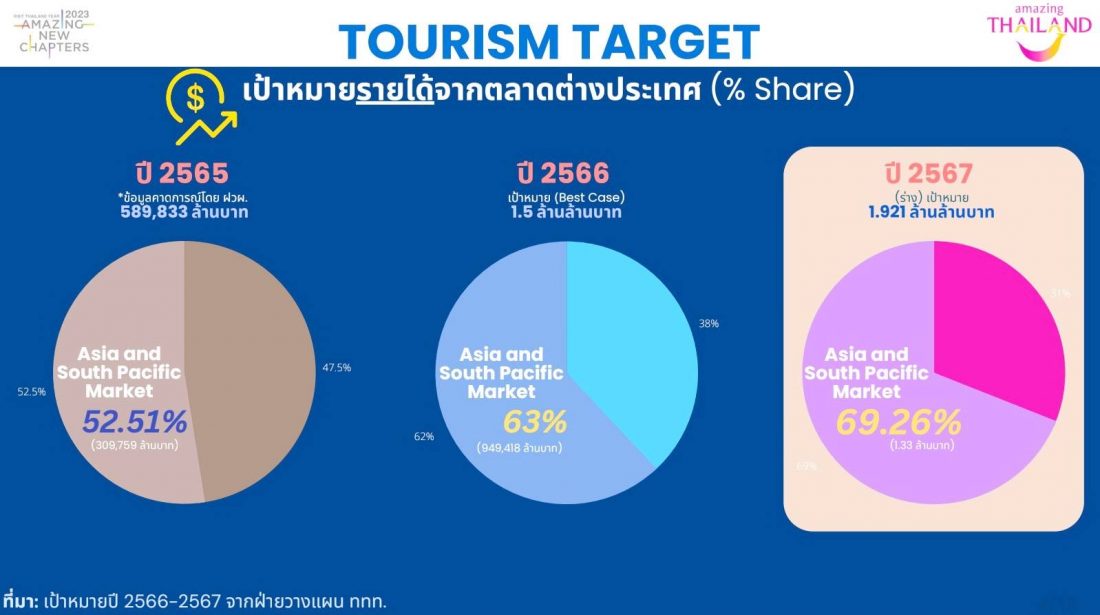 โดยมี “ตลาดเอเชียและแปซิฟิกใต้” เป็นผู้นำเข้านักท่องเที่ยวให้ได้มากที่สุดตามสัดส่วน 65-70 % ของทั้งหมด คิดเป็นจำนวนนักท่องเที่ยว 22 ล้านคนขึ้นไป และสร้างรายได้ประมาณ 1.1-1.3 ล้านล้านบาท