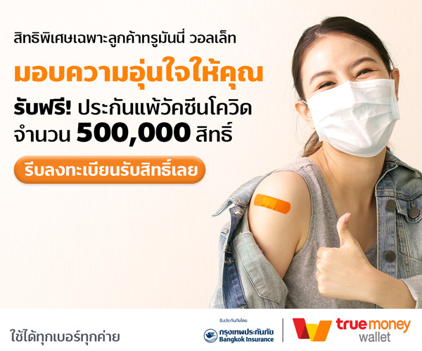นายธัญญพงศ์ ธรรมาวรานุคุปต์ กรรมการผู้จัดการใหญ่ (ร่วม) บริษัท แอสเซนด์ มันนี่ จำกัด กล่าวว่า ทรูมันนี่ห่วงใยผู้ใช้ จึงได้ร่วมมือกับ บมจ. กรุงเทพประกันภัย ช่วยแบ่งเบาความกังวลใจให้กับผู้ใช้ที่มีแผนไปรับการฉีดวัคซีนโควิด-19 ด้วยการมอบประกันภัยแพ้วัคซีนแก่ผู้ใช้ทรูมันนี่วอลเล็ท จำนวน 500,000 สิทธิ์* วงเงินคุ้มครองสูงสุด 100,000 บาท กรณีภาวะโคม่าที่ได้รับผลกระทบจากการฉีดวัคซีนป้องกันโรคติดเชื้อไวรัสโคโรนา 2019 และเพิ่มเติมพิเศษเงินปลอบขวัญ 10,000 บาท กรณีต้องนอนพักรักษาตัวในโรงพยาบาลเป็นผู้ป่วยในติดต่อกันไม่น้อยกว่า 7 วัน โดยมีระยะเวลาคุ้มครอง 60 วัน นับจากวันที่ฉีดวัคซีน ทั้งนี้ผู้รับสิทธิ์ต้องได้รับการฉีดวัคซีนภายในวันที่ 31 ธ.ค.2564