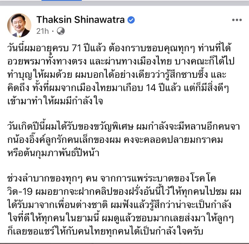 ผู้สื่อข่าวรายงานว่า นายทักษิณ ชินวัตร อดีตนายกรัฐมนตรี ได้โพสต์เฟซบุ๊ก Thaksin Shinawatra มีข้อความระบุว่า วันนี้ผมอายุครบ 71 ปีแล้ว ต้องกราบขอบคุณทุกๆ ท่านที่ได้อวยพรมาทั้งทางตรง และผ่านทางเมืองไทย บางคณะก็ได้ไปทำบุญให้ผมด้วย ผมบอกได้อย่างเดียวว่ารู้สึกซาบซึ้ง และคิดถึง ทั้งที่ผมจากเมืองไทยมาเกือบ 14 ปีแล้ว แต่ก็มีสิ่งดีๆ เข้ามาทำให้ผมมีกำลังใจ