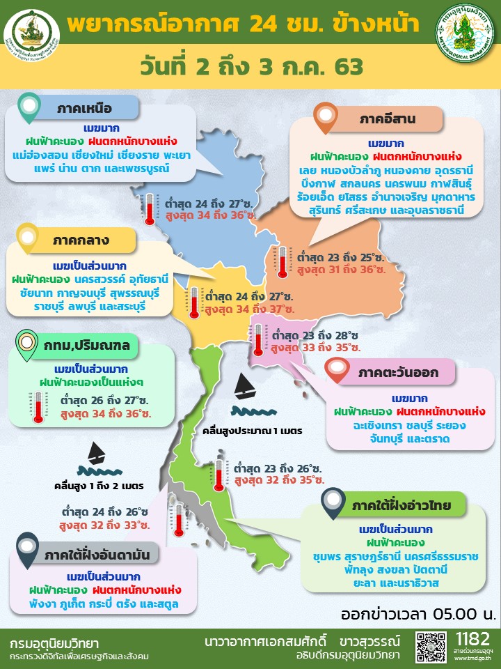 กรมอุตุนิยมวิทยา ได้พยากรณ์อากาศ 24 ชั่วโมงข้างหน้า ตั้งแต่เวลา 06:00 วันนี้ ถึง 06:00 วันพรุ่งนี้.มรสุมตะวันตกเฉียงใต้ที่พัดปกคลุมทะเลอันดามันและประเทศไทยมีกำลังปานกลาง ลักษณะเช่นนี้ทำให้บริเวณภาคเหนือ ภาคตะวันออกเฉียงเหนือ ภาคตะวันออก และภาคใต้ฝั่งตะวันตกมีฝนตกหนักบางแห่ง ขอให้ประชาชนบริเวณดังกล่าวระมัดระวังอันตรายจากฝนที่ตกหนักในระยะนี้ไว้ด้วย