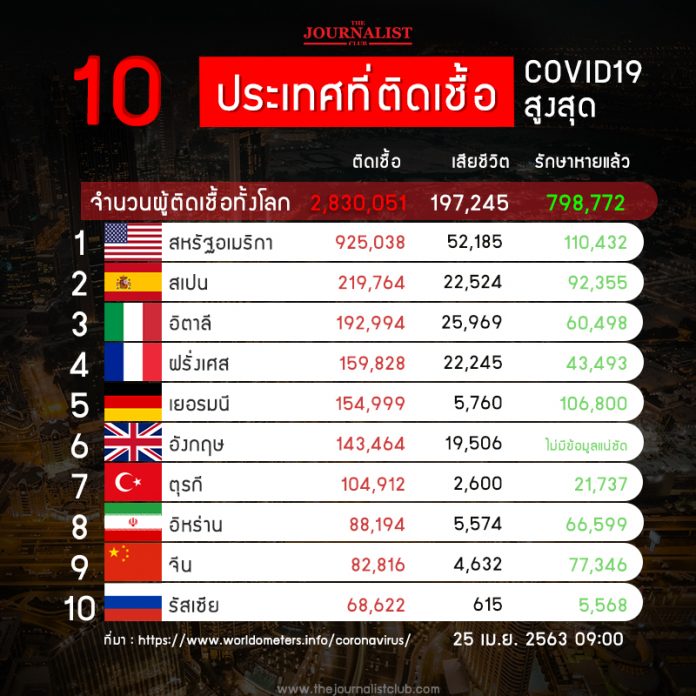 มึผู้ติดเชื้อไวรัสโควิด 19 แล้ว 2,830,051 คน เสียชีวิตรวม 197,245 คน รักษาหาย 798,772 คน โดย 5 ประเทศ ที่มีผู้ติดเชื้อมากสุด และเสียชีวิตมากสุด ดังนี้