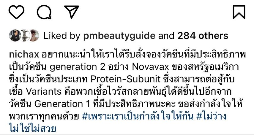 วันที่ 22 ก.ค.2564 ทูลกระหม่อมหญิงอุบลรัตนราชกัญญา สิริวัฒนาพรรณวดี ได้ทรงโพสต์อินสตราแกรม โดยระบุว่า อยากแนะนำให้เรารีบสั่งจองวัคซีนที่มีประสิทธิภาพเป็นวัคซีน generation 2 อย่าง Novavax ของสหรัฐอเมริกา ซึ่งเป็นวัคซีนประเภท Protein-Subunit ซึ่งสามารถต่อสู้กับเชื้อ Variants คือพวกเชื้อไวรัสกลายพันธุ์ได้ดีขึ้นไปอีกจากวัคซีน Generation 1 ที่มีประสิทธิภาพนะคะ ขอส่งกำลังใจให้พวกเราทุกคนด้วย #เพราะเราเป็นกำลังใจให้กัน #ไม่ว่างไม่ใช่ไม่สวย