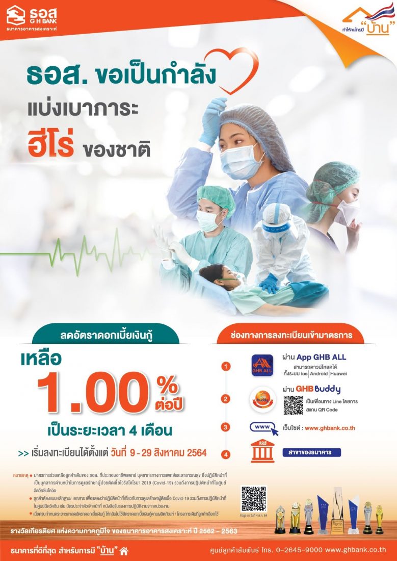 วันที่ 4 ส.ค.2564 นายฉัตรชัย ศิริไล กรรมการผู้จัดการ ธนาคารอาคารสงเคราะห์ (ธอส.) เปิดเผยว่า เพื่อขอบคุณและให้กำลังใจให้บุคลากรทางการแพทย์และสาธารณสุขทั่วประเทศซึ่งถือเป็นผู้ที่เสียสละทุ่มเทปฏิบัติหน้าที่ดูแลรักษาผู้ป่วยจากการแพร่ระบาดของเชื้อไวรัสโคโรนา 2019 (COVID-19) ธอส.ได้เตรียมวงเงิน 8,000 ล้านบาท จัดทำ “โครงการ My Hero : บุคลากรทางการแพทย์และสาธารณสุข” เพื่อส่งกำลังใจในการปฏิบัติหน้าที่ให้กับบุคลากรการแพทย์และสาธารณสุข โดยลดอัตราดอกเบี้ยเงินกู้เหลือ 1.00% ต่อปี จากทุกอัตราดอกเบี้ยที่บุคลากรการแพทย์และสาธารณสุขใช้อยู่ในปัจจุบันเป็นระยะเวลานาน 4 เดือน คือ ตั้งแต่วันที่ 1 กันยายน – 31 ธันวาคม 2564