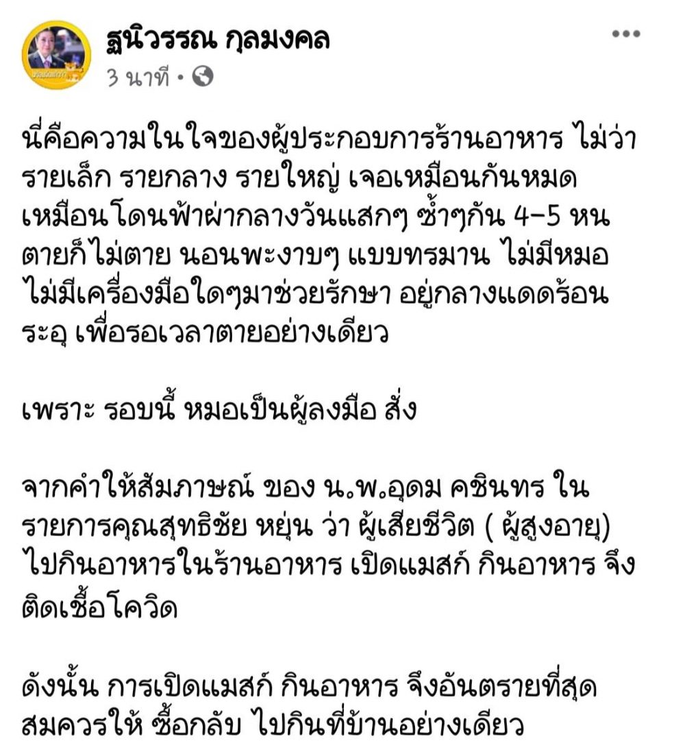 ล่าสุดนางฐนิวรรณ กุลมงคล นายกสมาคมภัตตาคารไทย โพสต์ผ่านเฟซบุ๊กส่วนตัว ระบุว่า นี่คือความในใจของผู้ประกอบการร้านอาหาร ไม่ว่ารายเล็ก รายกลาง รายใหญ่ เจอเหมือนกันหมด เหมือนโดนฟ้าผ่ากลางวันแสกๆ ซ้ำๆกัน 4-5 หน ตายก็ไม่ตาย นอนพะงาบๆ แบบทรมาน ไม่มีหมอ ไม่มีเครื่องมือใดๆมาช่วยรักษา อยู่กลางแดดร้อนระอุ เพื่อรอเวลาตายอย่างเดียว