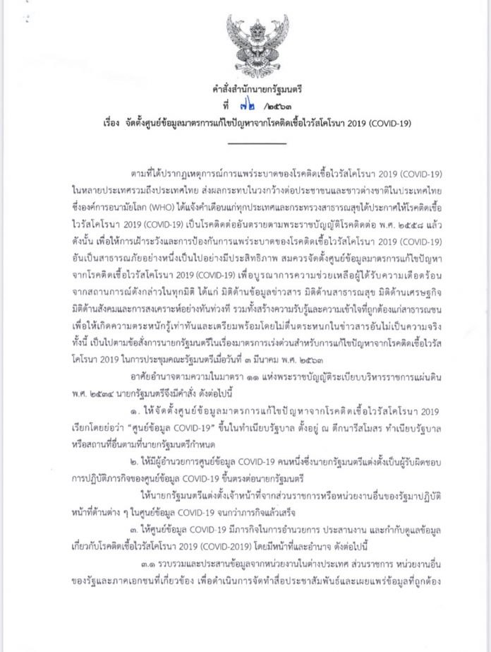 เรื่อง จัดตั้งศูนย์ข้อมูลมาตรการแก้ไขปัญหาจากโรคติดเชื้อไวรัสโคโรนา 2019 (COVID-19) มีเนื้อหาว่า ตามที่ได้ปรากฎเหตุการณ์การแพร่ระบาดของโรคติดเชื้อไวรัสโคโรนา 2019 (COVID-19)ในหลายประเทศรวมถึงประเทศไทย ส่งผลกระทบในวงกว้างต่อประชาชนและชาวต่างชาติในประเทศไทย ซึ่งองค์การอนามัยโลก (WHO) ได้แจ้งคำเตือนแก่ทุกประเทศและกระทรวงสาธารณสุขได้ประกาศให้โรคติดเชื้อ ไวรัสโคโรนา 2019 (COVD-19) เป็นโรคติดต่ออันตรายตามพระราชบัญญัติโรคติดต่อ พ.ศ.2558 แล้ว