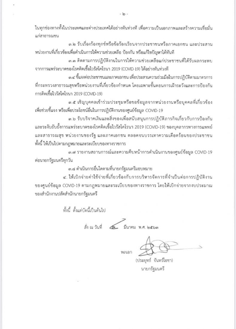 2. ให้มีผู้อำนวยการศูนย์ข้อมูล COVID-19 คนหนึ่งซึ่งนายกรัฐมนตรีแต่งตั้งเป็นผู้รับผิดชอบการปฏิบัติภารกิจของศูนย์ข้อมูล COVD-19 ขึ้นตรงต่อนายกรัฐมนตรี ให้นายกรัฐมนตรีแต่งตั้งเจ้าหน้าที่จากส่วนราชการหรือหน่วยงานอื่นของรัฐมาปฏิบัติหน้าที่ด้านต่าง ๆ ในศูนย์ข้อมูล COVID-19 จนกว่าภารกิจแล้วเสร็จ