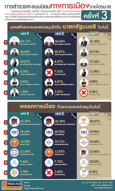 ศูนย์สำรวจความคิดเห็น “นิด้าโพล” สถาบันบัณฑิตพัฒนบริหารศาสตร์ (นิด้า) เปิดเผยผลสำรวจของประชาชน เรื่อง “การสำรวจคะแนนนิยมทางการเมืองรายไตรมาสครั้งที่ 3” ทำการสำรวจระหว่างวันที่ 18 – 23 กันยายน 2563 จากประชาชนที่มีอายุ 18 ปีขึ้นไป กระจายทุกภูมิภาค ระดับการศึกษา และอาชีพทั่วประเทศ รวมทั้งสิ้น จำนวน 2,527 หน่วยตัวอย่าง เกี่ยวกับการสำรวจคะแนนนิยมทางการเมือง การสำรวจอาศัย การสุ่มตัวอย่างโดยใช้ความน่าจะเป็นจากบัญชีรายชื่อฐานข้อมูลตัวอย่างหลัก (Master Sample) ของ “นิด้าโพล” สุ่มตัวอย่างด้วยวิธีแบบง่าย (Simple Random Sampling) เก็บข้อมูลด้วยวิธีการสัมภาษณ์ทางโทรศัพท์ โดยกำหนดค่าความเชื่อมั่นที่ร้อยละ 97.0