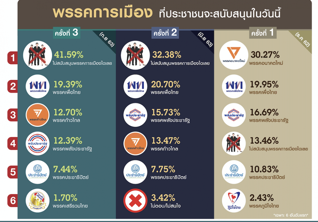 ท้ายที่สุด เมื่อถามถึงพรรคการเมืองที่ประชาชนจะสนับสนุนในวันนี้ พบว่า อันดับ 1 ร้อยละ 41.59 ระบุว่าเป็น ไม่สนับสนุน พรรคการเมืองใดเลย อันดับ 2 ร้อยละ 19.39 ระบุว่าเป็น พรรคเพื่อไทย อันดับ 3 ร้อยละ 12.70 ระบุว่าเป็น พรรคก้าวไกล อันดับ 4 ร้อยละ 12.39 ระบุว่าเป็น พรรคพลังประชารัฐ อันดับ 5 ร้อยละ 7.44 ระบุว่าเป็น พรรคประชาธิปัตย์ อันดับ 6 ร้อยละ 1.70 ระบุว่าเป็น พรรคเสรีรวมไทย อันดับ 7 ร้อยละ 1.58 ระบุว่าเป็น พรรคภูมิใจไทย อันดับ 8 ร้อยละ 0.79 ระบุว่าเป็น พรรคกล้า อันดับ 9 ร้อยละ 0.59 ระบุว่าเป็น พรรคเพื่อชาติ อันดับ 10 ร้อยละ 0.55 ระบุว่าเป็น ไม่ตอบ/ไม่สนใจ อันดับ 11 ร้อยละ 0.36 ระบุว่าเป็น พรรคชาติไทยพัฒนา อันดับ 12 ร้อยละ 0.28 ระบุว่าเป็น พรรคชาติพัฒนา และพรรคประชาชาติ ในสัดส่วนที่เท่ากัน อันดับ 13 ร้อยละ 0.24 ระบุว่าเป็น พรรครวมพลังประชาชาติไทย และอันดับ 14 ร้อยละ 0.12 ระบุว่าเป็น พรรคเศรษฐกิจใหม่