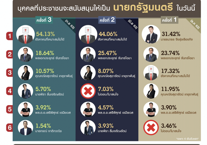 จากการสำรวจเมื่อถามถึงบุคคลที่ประชาชนจะสนับสนุนให้เป็นนายกรัฐมนตรีในวันนี้ พบว่า อันดับ 1 ร้อยละ 54.13 ระบุว่า ยังหาคนที่เหมาะสมไม่ได้ อันดับ 2 ร้อยละ 18.64 ระบุว่าเป็น พลเอกประยุทธ์ จันทร์โอชา เพราะ เป็นคนจริงจังกับการทำงาน ทำงานตรงไปตรงมา มีความซื่อสัตย์ บ้านเมืองสงบไม่วุ่นวาย ช่วยเหลือประชาชนได้จริง ขณะที่บางส่วนระบุว่า อยากให้ดำรงตำแหน่งต่อไป อันดับ 3 ร้อยละ 10.57 ระบุว่าเป็น คุณหญิงสุดารัตน์ เกยุราพันธุ์ (พรรคเพื่อไทย) เพราะ มีประสบการณ์การทำงาน บริหารงานที่ผ่านมาได้ดี พูดจริง ทำจริง และชื่นชอบเป็นการส่วนตัว อันดับ 4 ร้อยละ 5.70 ระบุว่าเป็น นายพิธา ลิ้มเจริญรัตน์ (พรรคก้าวไกล) เพราะ อยากได้คนรุ่นใหม่มาบริหารประเทศ เป็นคนที่มีความคิดที่ทันสมัย มองการณ์ไกล และชื่นชอบนโยบายพรรค อันดับ 5 ร้อยละ 3.92 ระบุว่าเป็น พล.ต.อ.เสรีพิศุทธ์ เตมียเวส (พรรคเสรีรวมไทย) เพราะ เป็นคนตรงไปตรงมา พูดจริง ทำจริง มีความซื่อสัตย์ และชื่นชอบเป็นการส่วนตัว อันดับ 6 ร้อยละ 1.54 ระบุว่าเป็น นายกรณ์ จาติกวณิช (พรรคกล้า) เพราะ มีวิสัยทัศน์ที่ดี มีความเป็นผู้นำ มีความสามารถทางด้านเศษฐกิจ ขณะที่บางส่วนระบุว่า มีความเข้าใจการเมืองทั้งแบบเก่าและแบบใหม่ อันดับ 7 ร้อยละ 1.07 ระบุว่าเป็น นายสมพงษ์ อมรวิวัฒน์ (พรรคเพื่อไทย) เพราะ ชอบผลงาน ของพรรคเพื่อไทย ชื่นชอบนโยบายด้านเศรษฐกิจ ขณะที่บางส่วนระบุว่า ประชาชนเข้าถึงได้ง่าย ร้อยละ 4.00 ระบุอื่น ๆ ได้แก่ นายมิ่งขวัญ แสงสุวรรณ์ (พรรคเศรษฐกิจใหม่), นายจุรินทร์ ลักษณวิศิษฏ์ (พรรคประชาธิปัตย์), นายอนุทิน ชาญวีรกูล (พรรคภูมิใจไทย), นายวันมูหะมัดนอร์ มะทา (พรรคประชาชาติ), นายเทวัญ ลิปตพัลลภ (พรรคชาติพัฒนา), นายชวน หลีกภัย, นายอานันท์ปันยารชุน, นายอภิสิทธิ์ เวชชาชีวะและน.ส.กัญจนา ศิลปอาชา (พรรคชาติไทยพัฒนา) และร้อยละ 0.43 ระบุว่า ไม่ตอบ/ไม่สนใจ
