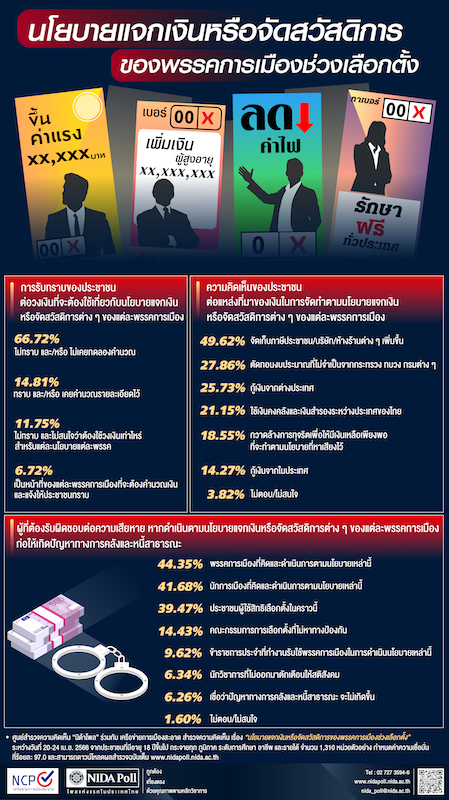 ผู้สื่อข่าวรายงานว่า ศูนย์สำรวจความคิดเห็น “นิด้าโพล” สถาบันบัณฑิตพัฒนบริหารศาสตร์ (นิด้า) ร่วมกับเครือข่ายการเมืองสะอาด สำรวจความคิดเห็น เรื่อง “นโยบายแจกเงินหรือจัดสวัสดิการของพรรคการเมืองช่วงเลือกตั้ง” ทำการสำรวจระหว่างวันที่ 20-24 เมษายน 2566 จากประชาชนที่มีอายุ 18 ปีขึ้นไป กระจายทุกภูมิภาค ระดับการศึกษา อาชีพ และรายได้ ทั่วประเทศ รวมทั้งสิ้น จำนวน 1,310 หน่วยตัวอย่าง เกี่ยวกับนโยบายแจกเงินหรือจัดสวัสดิการของพรรคการเมืองช่วงเลือกตั้ง การสำรวจอาศัยการสุ่มตัวอย่างโดยใช้ความน่าจะเป็นจากบัญชีรายชื่อฐานข้อมูลตัวอย่างหลัก (Master Sample) ของ “นิด้าโพล” สุ่มตัวอย่างด้วยวิธีแบบง่าย (Simple Random Sampling) เก็บข้อมูลด้วยวิธีการสัมภาษณ์ทางโทรศัพท์ โดยกำหนดค่าความเชื่อมั่น ร้อยละ 97.0