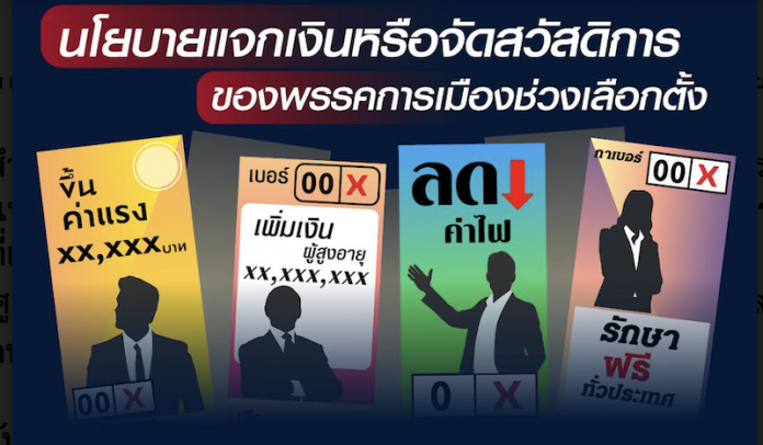 ด้านความคิดเห็นของประชาชนต่อแหล่งที่มาของเงินในการจัดทำตามนโยบายแจกเงินหรือจัดสวัสดิการต่าง ๆ ของแต่ละพรรคการเมือง พบว่า ตัวอย่าง ร้อยละ 49.62 ระบุว่า จัดเก็บภาษีประชาชน/บริษัท/ห้างร้านต่าง ๆ เพิ่มขึ้น รองลงมา ร้อยละ 27.86 ระบุว่า ตัดทอนงบประมาณที่ไม่จำเป็นจากกระทรวง ทบวง กรมต่าง ๆ ร้อยละ 25.73 ระบุว่า กู้เงินจากต่างประเทศ ร้อยละ 21.15 ระบุว่า ใช้เงินคงคลังและเงินสำรองระหว่างประเทศของไทย ร้อยละ 18.55 ระบุว่า กวาดล้างการทุจริตเพื่อให้มีเงินเหลือเพียงพอที่จะทำตามนโยบายที่หาเสียงไว้ ร้อยละ 14.27 ระบุว่า กู้เงินจากในประเทศ และร้อยละ 3.82 ระบุว่า ไม่ตอบ/ไม่สนใจ