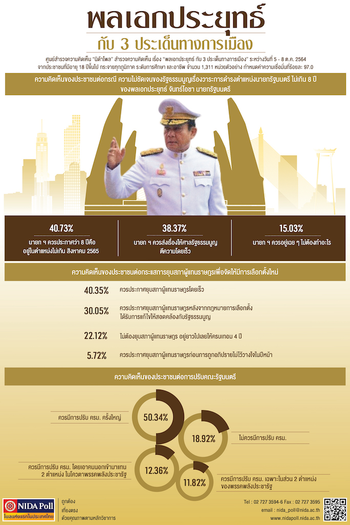 ผู้สื่อข่าวรายงานว่า ศูนย์สำรวจความคิดเห็น “นิด้าโพล” สถาบันบัณฑิตพัฒนบริหารศาสตร์ (นิด้า) เปิดเผยผลสำรวจของประชาชน เรื่อง “พลเอกประยุทธ์ กับ 3 ประเด็นทางการเมือง” ทำการสำรวจระหว่างวันที่ 5 – 8 ตุลาคม 2564 จากประชาชนที่มีอายุ 18 ปีขึ้นไป กระจายทุกภูมิภาค ระดับการศึกษา  และอาชีพทั่วประเทศ รวมทั้งสิ้น จำนวน 1,311 หน่วยตัวอย่าง เกี่ยวกับพลเอกประยุทธ์ กับ 3 ประเด็นทางการเมือง การสำรวจอาศัยการสุ่มตัวอย่างโดยใช้ความน่าจะเป็นจากบัญชีรายชื่อฐานข้อมูลตัวอย่างหลัก (Master Sample) ของ “นิด้าโพล” สุ่มตัวอย่างด้วยวิธีแบบง่าย (Simple Random Sampling) เก็บข้อมูลด้วยวิธีการสัมภาษณ์ทางโทรศัพท์โดยกำหนดค่าความเชื่อมั่นที่ร้อยละ 97.0