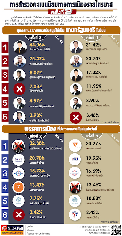ศูนย์สำรวจความคิดเห็น “นิด้าโพล” สถาบันบัณฑิตพัฒนบริหารศาสตร์ (นิด้า)  ได้เปิดเผยผลสำรวจของประชาชน เรื่อง “การสำรวจคะแนนนิยมทางการเมืองรายไตรมาส ครั้งที่ 2” ทำการสำรวจระหว่างวันที่ 22 – 24 มิถุนายน 2563 จากประชาชนที่มีอายุ 18 ปีขึ้นไป กระจายทุกภูมิภาค ระดับการศึกษา และอาชีพทั่วประเทศ รวมทั้งสิ้น จำนวน 2,517 หน่วยตัวอย่าง เกี่ยวกับการสำรวจคะแนนนิยมทางการเมือง การสำรวจอาศัย  การสุ่มตัวอย่างโดยใช้ความน่าจะเป็นจากบัญชีรายชื่อฐานข้อมูลตัวอย่างหลัก (Master Sample) ของ “นิด้าโพล” สุ่มตัวอย่างด้วยวิธีแบบง่าย    (Simple Random Sampling) เก็บข้อมูลด้วยวิธีการสัมภาษณ์ทางโทรศัพท์ โดยกำหนดค่าความเชื่อมั่นที่ร้อยละ 95.0
