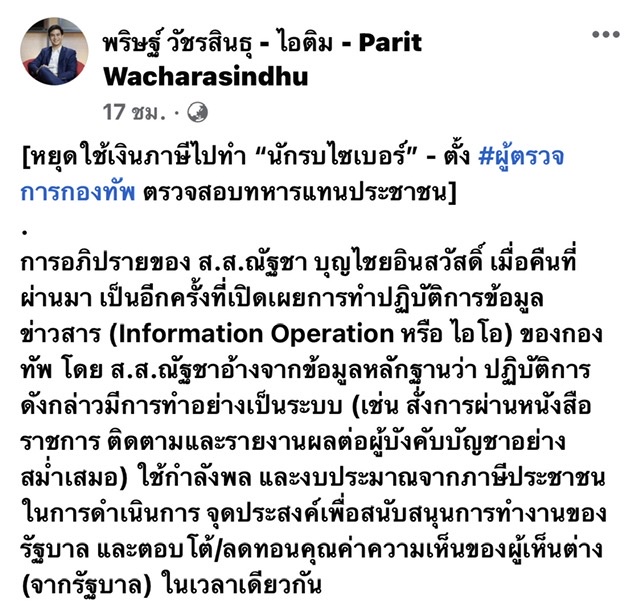 - เผยหยุดใช้เงินภาษีไปทำ “’นักรบไซเบอร์” ลั่นการอวยผลงานรัฐบาล หรือตอบโต้คนเห็นต่าง ไม่ใช่หน้าที่ของกองทัพ