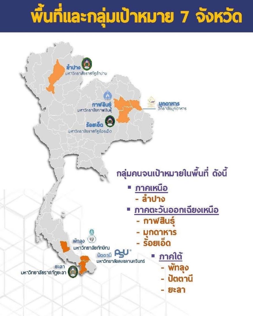 โดยบูรณาการความร่วมมือกับมหาวิทยาลัยเพื่อการพัฒนาพื้นที่ 9 แห่ง ได้แก่ 1.มหาวิทยาลัยราชภัฏลำปาง2.มหาวิทยาลัยกาฬสินธุ์ 3.วิทยาลัยชุมชนมุกดาหาร 4.มหาวิทยาลัยราชภัฏร้อยเอ็ด 5.มหาวิทยาลัยทักษิณ6.วิทยาเขตพัทลุง 7.มหาวิทยาลัยราชภัฏยะลา 8.มหาวิทยาลัยสงขลานครินทร์ และ 9.มหาวิทยาลัยนราธิวาสราชนครินทร์